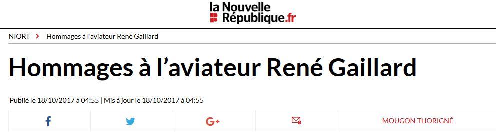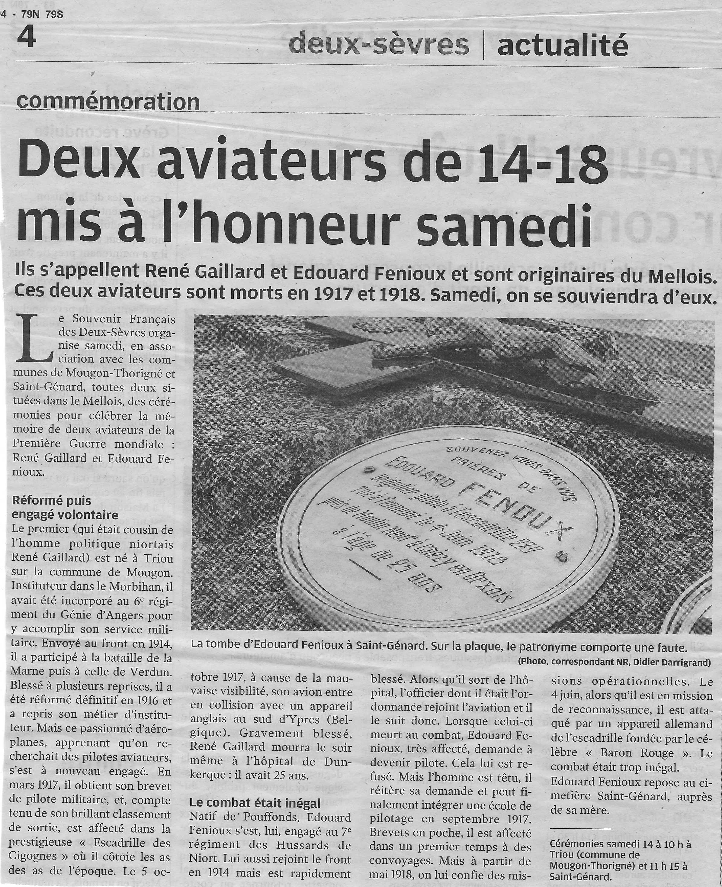 Le Souvenir français a organisé samedi dernier une cérémonie en hommage à l’aviateur de la Première Guerre mondiale René Gaillard, mort au combat en 1917. Le commandant Claude Pierre, président du Souvenir français de Celles-sur-Belle, a retracé la vie de l’aviateur (lire NR de vendredi 13 septembre), en présence du maire de Thorigné-Mougon, Francis Proust, du colonel Jaubert, délégué général du Souvenir français et des conseillers municipaux. |