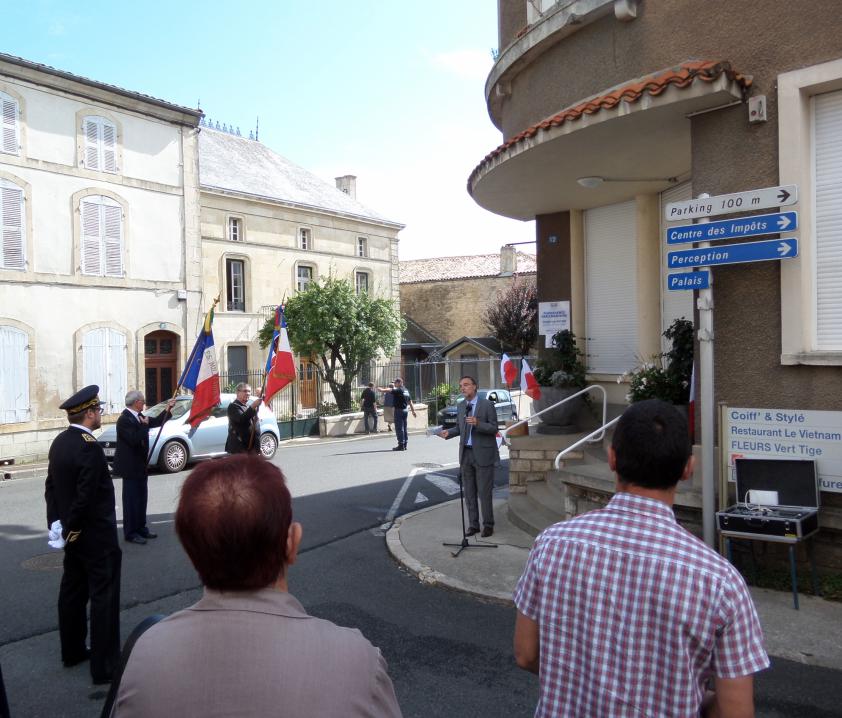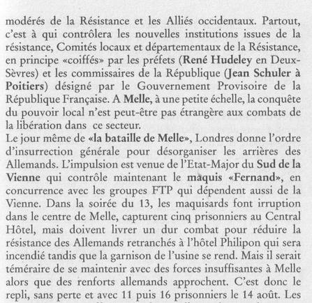 la diffusion du chant des Esclaves de Verdi la lecture du recit des combats le dépôt des gerbes le chant de la Marseillaise Une forte pluie diluvienne s'invita lors de la diffusion de l'hyme national Les participants durent encore patienter sous cette pluie pour écouter le discours final de Mr le Maire évoquant les différents lieux de souvenir de MELLE : - Avenue Aubin – Avenue Bernier – Place René Groussard – rue Prosper Costart – et la stèle de la Résistance