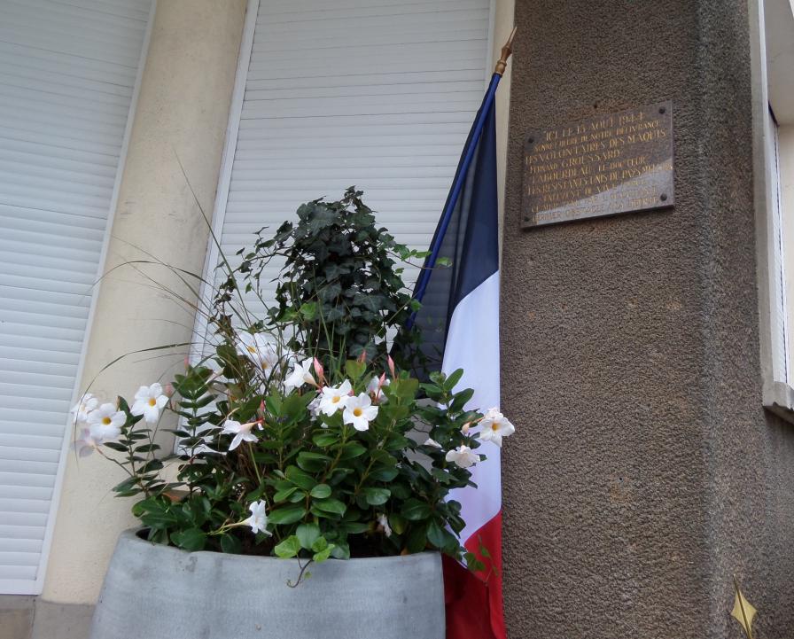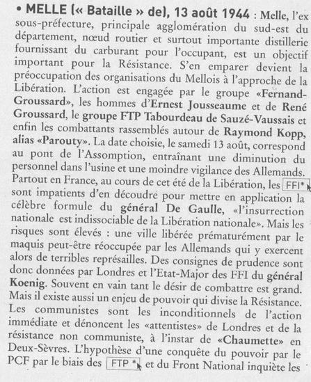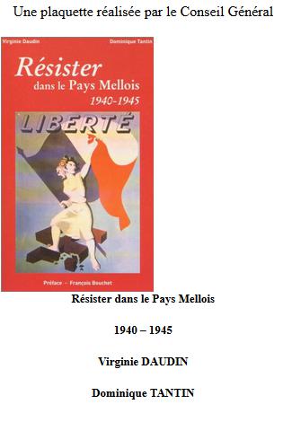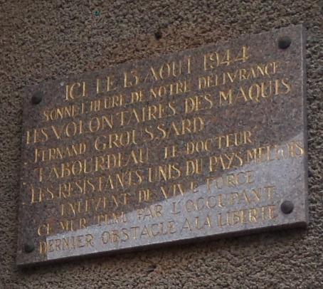 ICI LE 13 AOUT 1944 SONNE L'HEURE DE NOTRE DELIVRANCE LES VOLONTAIRES DES MAQUIS FERNAND GROUSSARD TABOURDEAU LE DOCTEUR LES RESISTANTS DU PAYS MELLOIS ENLEVENT DE VIVE FORCE CE MUR TENU PAR L'OCCUPANT DERNIER OBSTACLE A LA LIBERTE |