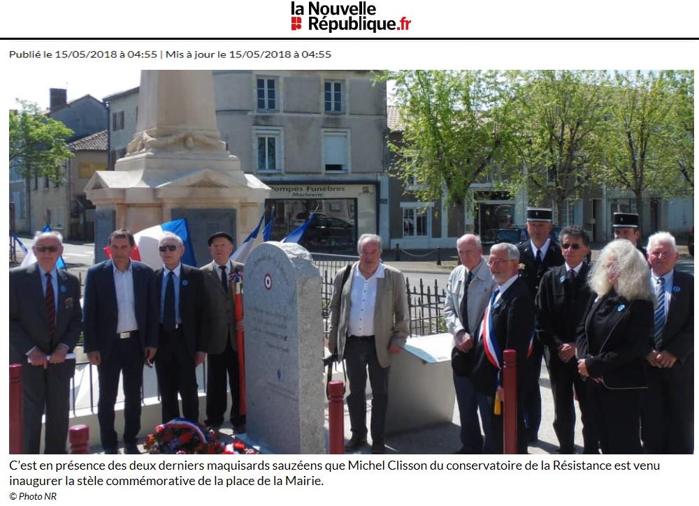C’est lors de la cérémonie du 8 Mai, qu’a été inaugurée, sur la place de la Mairie à Sauzé, à côté du monument aux morts, la stèle commémorative de la Résistance sauzéenne. « C’est sur proposition du conservatoire de la Résistance des Deux-Sèvres, et avec le soutien du conseil départemental, que notre commune a souhaité ancrer sur ce lieu emblématique une stèle commémorative des actions de résistance de nos aînés du Sauzéen durant la période d’occupation par les nazis […] Cette stèle accompagnée d’un pupitre relatant les actions de résistance restera pour les générations à venir le témoignage du patriotisme de nos aînés. » C’est par ces mots que Michel Eprinchard, maire de Sauzé et lui-même fils de résistant, a débuté son discours, avant que ne soit dévoilée la stèle par les enfants de l’école primaire. Parmi les nombreuses personnalités présentes, il y avait le comité de l’ANACR avec deux anciens résistants du sauzéen : René Auvin et Marceau Fragnaud, et Michel Clisson, le président du conservatoire de la Résistance et de la Déportation, qui est venu avec beaucoup d’émotion expliquer que c’est sur l’endroit même de cette stèle que son père et deux de ses compagnons maquisards se sont faits arrêter le 21 août 44 pour être fusillés le lendemain. Lui qui était alors un enfant de 14 ans a continué le combat. Il a rappelé aussi l’héroïsme exemplaire des quelque 200 maquisards de la région qui fin 1944, par leurs actions, ont ralenti l’avancée des troupes allemandes vers la Normandie. « La Résistance était un combat à la fois militaire et idéologique : chasser les occupants de France et combattre la doctrine nazie. Un message collectif qui s’adresse particulièrement aux jeunes, car c’est aussi une leçon pour le futur. » Il s’est félicité aussi de l’engagement des jeunes qui perpétuent le devoir de mémoire, toujours plus nombreux chaque année. Deux élèves, Hervé et Lucas, du collège Anne-Frank, sont d’ailleurs venus lire un poème rendant hommage à la Résistance, écrit par une réfugiée. En plus de la remise des gerbes, des discours des différentes personnalités présentes, du passage en revue des porte-drapeaux et des sapeurs-pompiers, et de la Marseillaise, un enregistrement du chant des Partisans, chanté par un ancien résistant, a été diffusé. Un vin d’honneur sur la place a conclu cette belle cérémonie. |