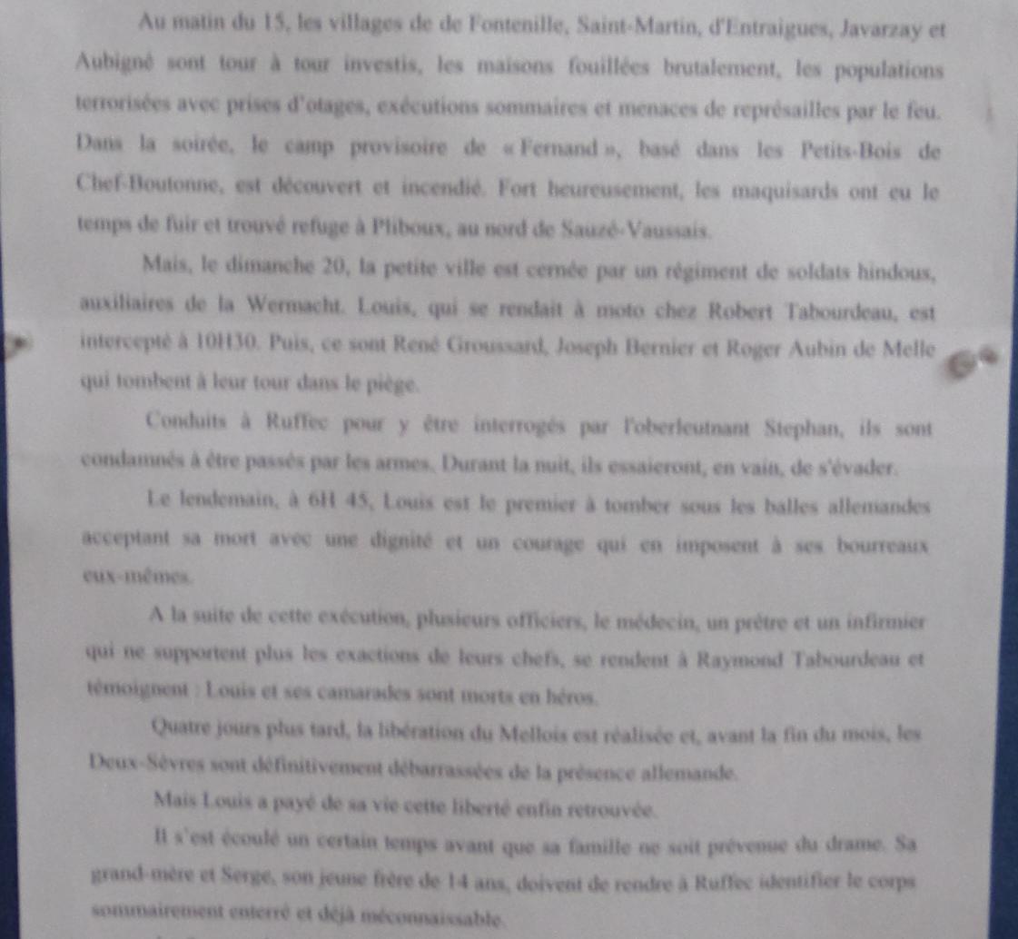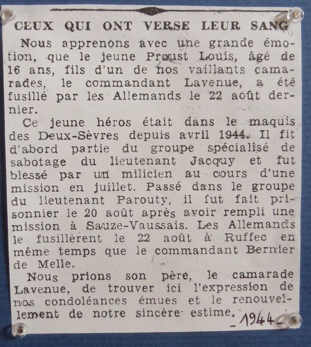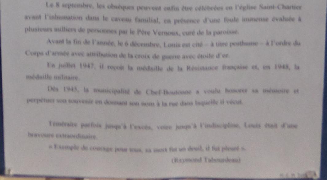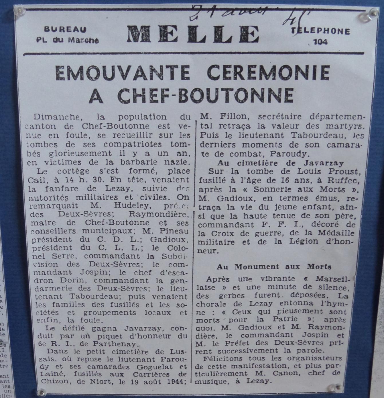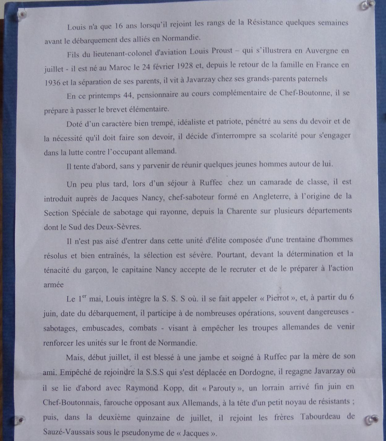 Durant le mois d'août 2014, dans le hall de la mairie de CHEF BOUTONNE était exposé un panneau relatant la brève existance de Louis PROUST, un héros de CHEF BOUTONNE, qui repose au cimetière de Javarzay