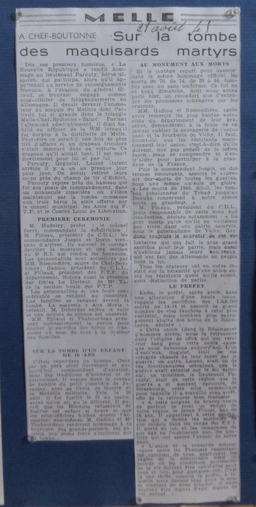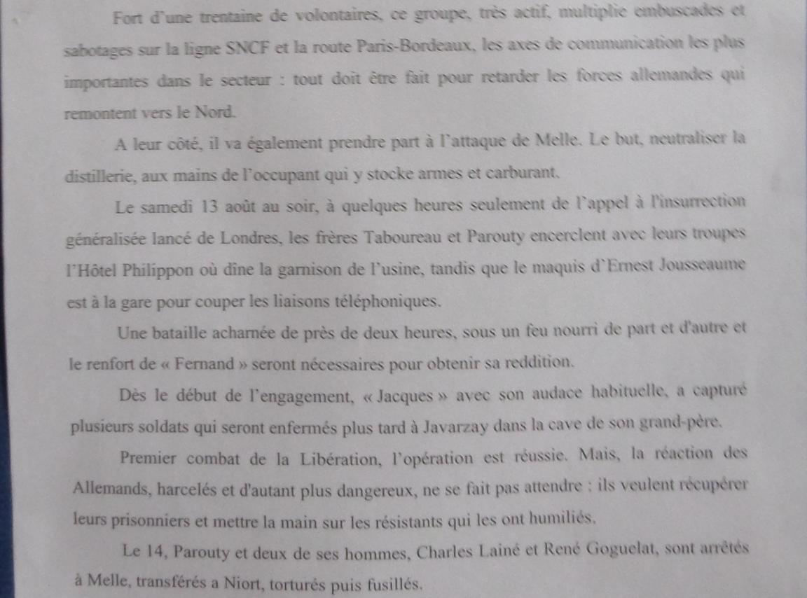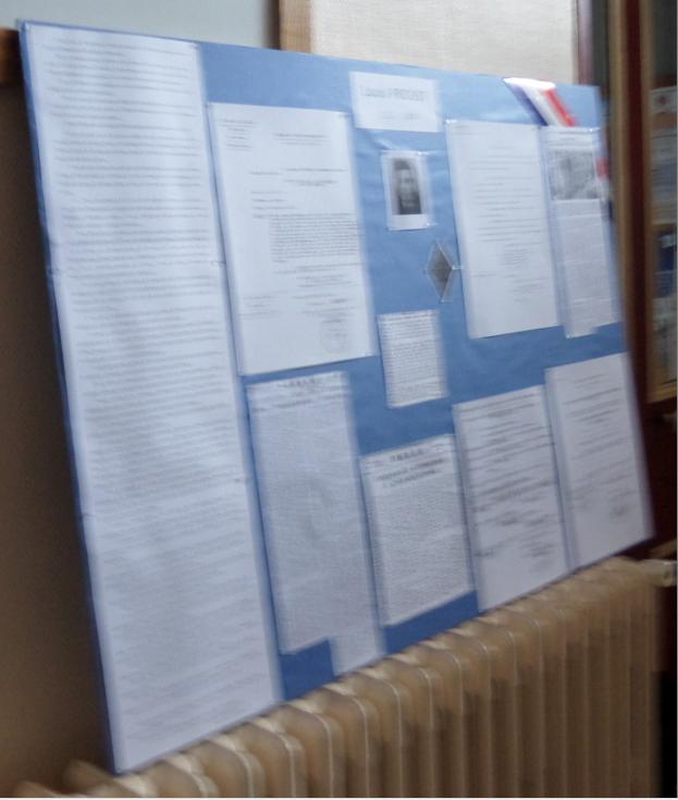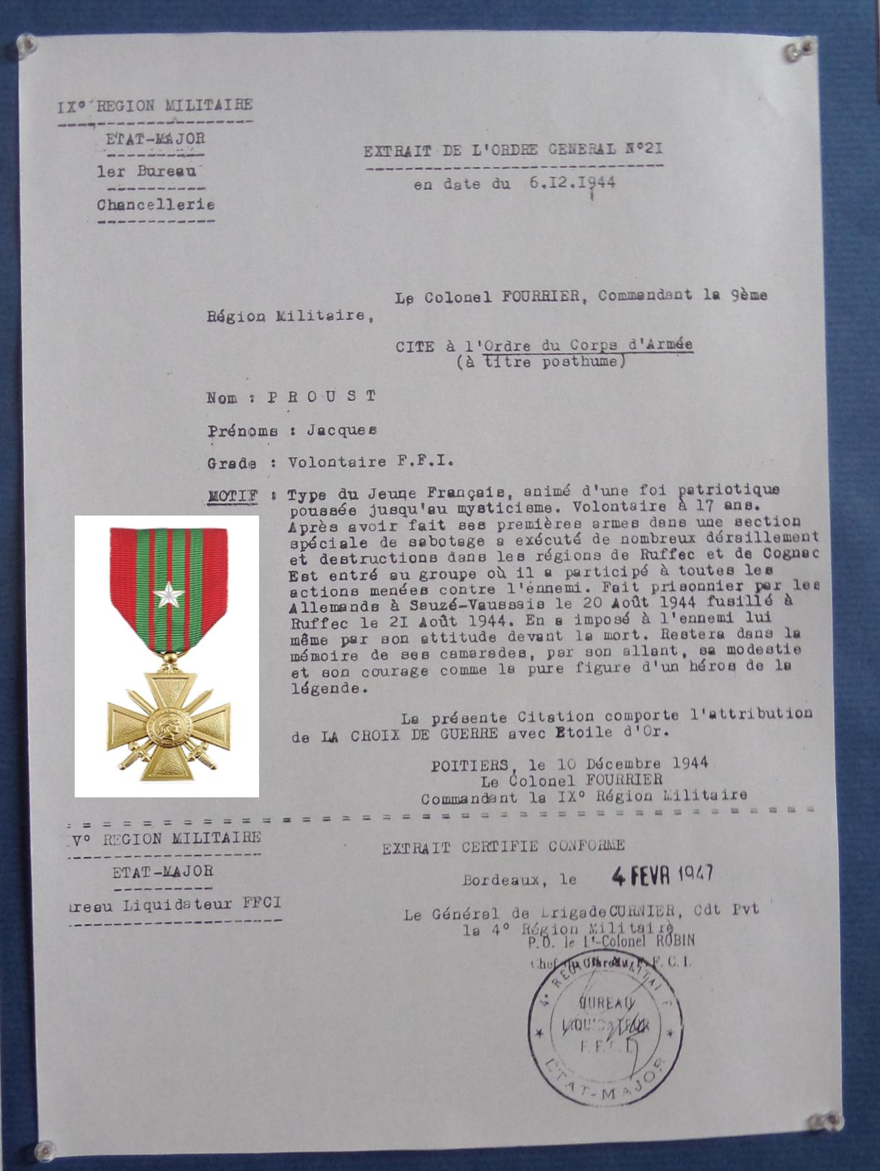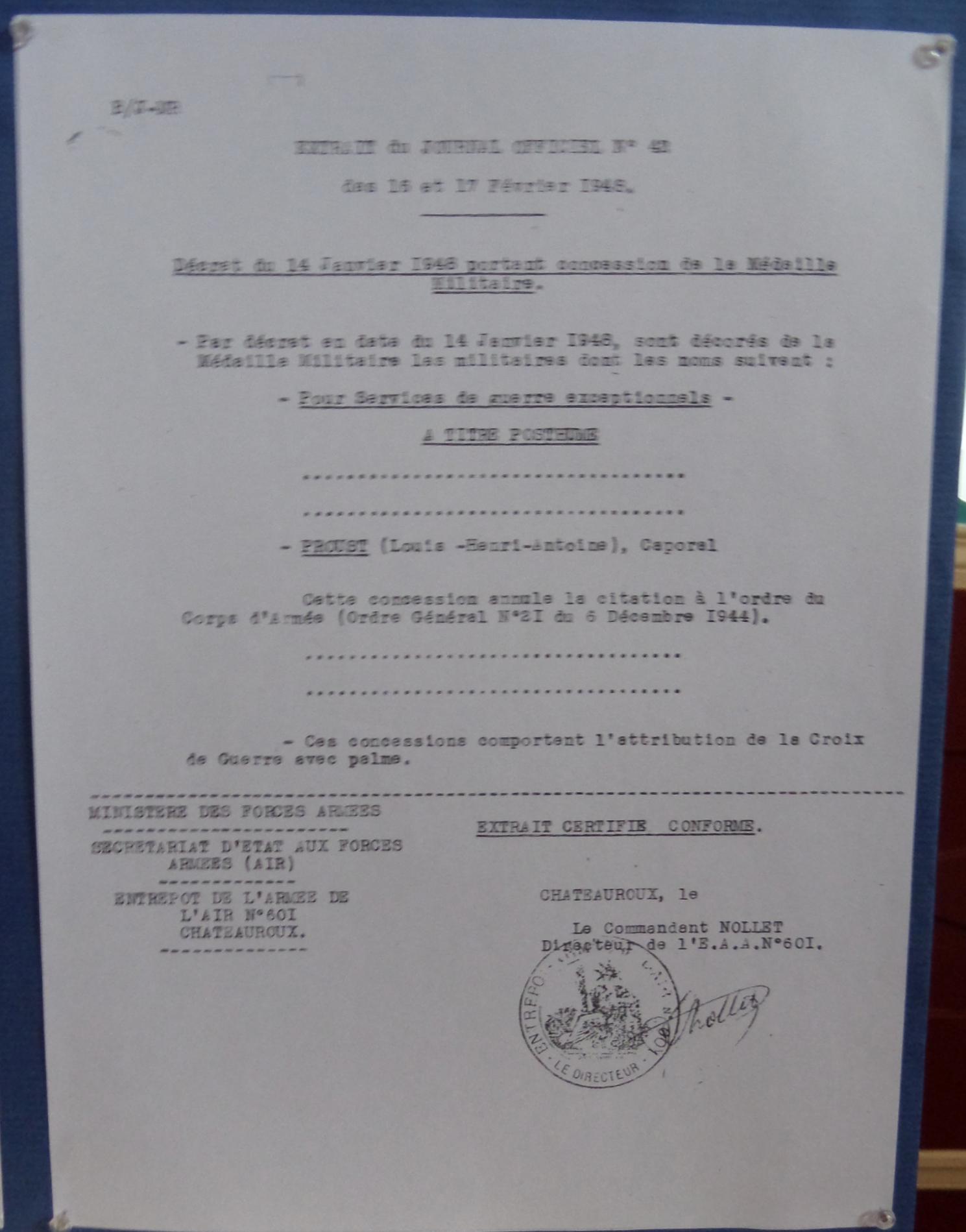 Durant le mois d'août 2014, dans le hall de la mairie de CHEF BOUTONNE était exposé un panneau relatant la brève existance de Louis PROUST, un héros de CHEF BOUTONNE, qui repose au cimetière de Javarzay