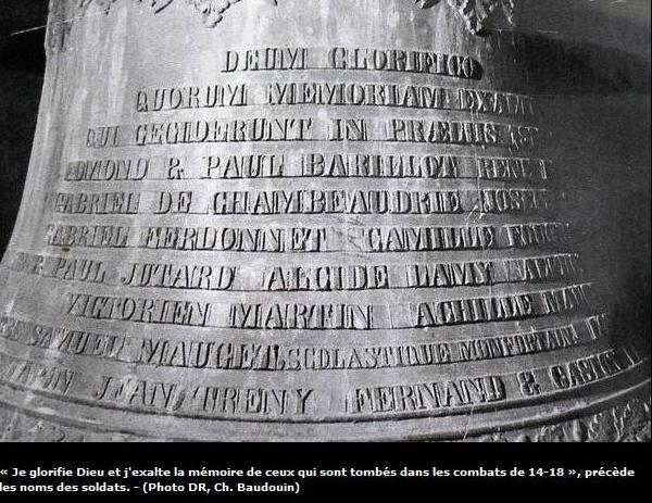 DEUM GLORIFICO QUORUM MEMORIAM EXAL.... QUI GEGIDERUNT IN PRAELIS EST EDMOND & PAUL BARILLOT RENE GORNARD GABRIEL DE CHAMBEAUDRIE JOSEPH GABRIEL FERDONNET CAMILLE FOUQUAULT HENRI & PAUL JUTARD ALCIDE LAMY A... VICTORIEN MARTIN ACHILLE M.... … SAMUEL MAUGET SCOLASTIQUE MONFORTAIN … GEORGES & MARCEL TAPIN JEAN TRENY FERNAND & GASTON VILLENEUVE