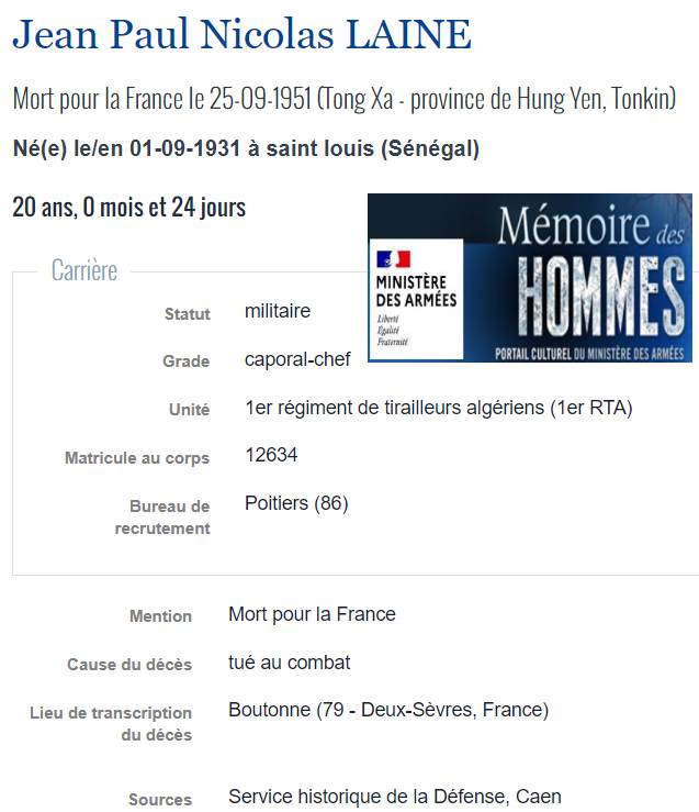 LAINE Jean Paul Nicolas né le 01-09-1931 Sénégal |