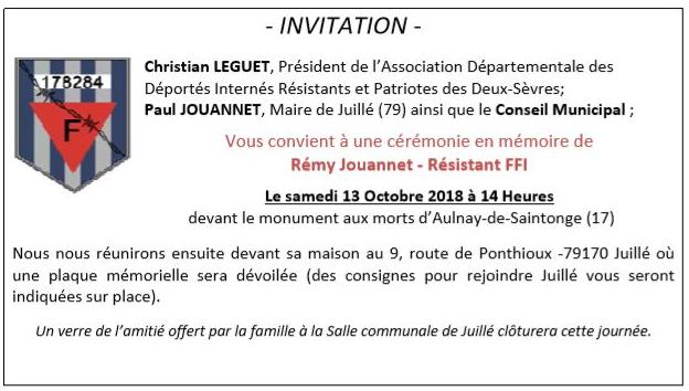 Cérémonie en l'honneur du résistant déporté « Rémy JOUANNET » (1923/1998) |