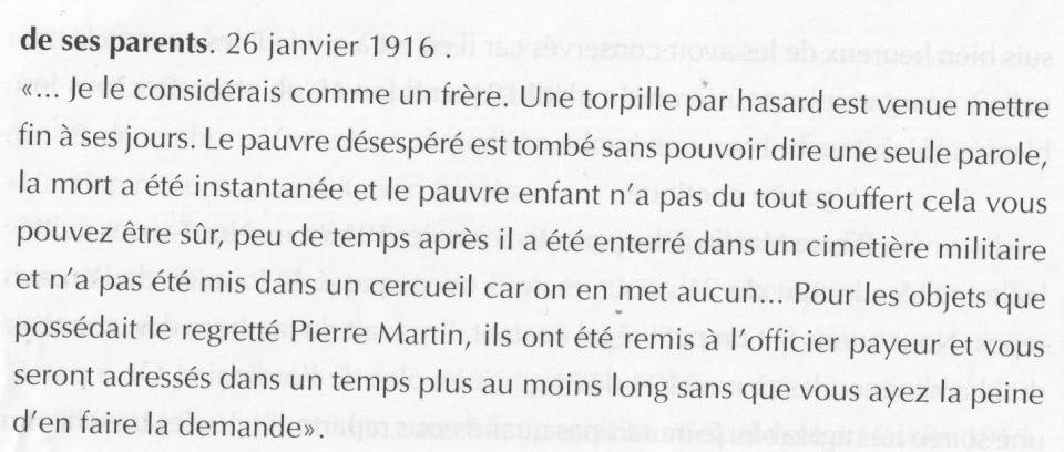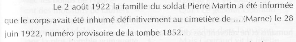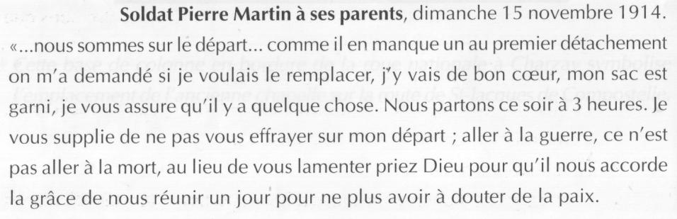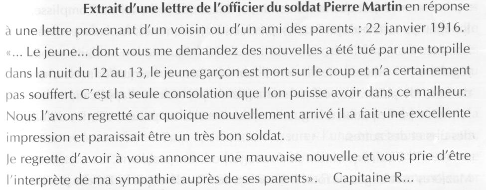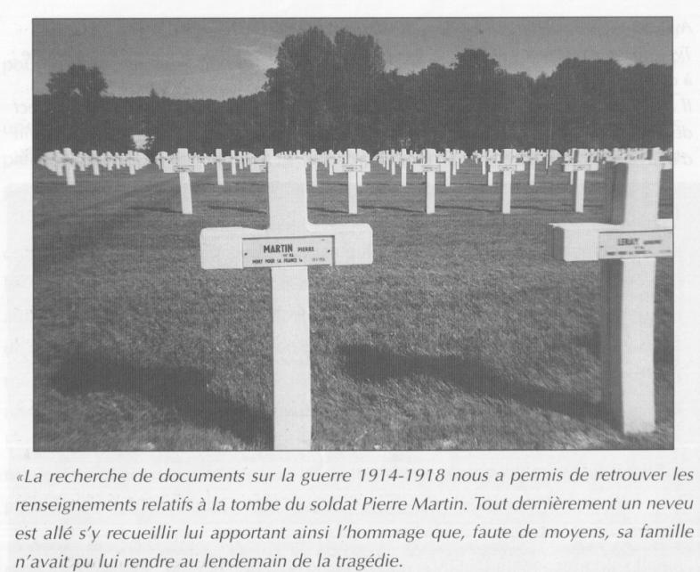 Pierre Henri MARTIN est né le 08/09/1894 à SAINT ROMANS LES MELLE (79) ou il passa ses premières années avant que son père cultivateur s'installe dans la commune voisine de MAZIERES SUR BERONNE (après 1906) Il aida ses parents à la culture Il n'a pas eu le temps de faire son service militaire mobilisé à ses 20 ans le 09 septembre 1914 au 125° Régiment d'Infanterie de POITIERS, il passa ensuite au 115° le 14 décembre 1915 avant de trouver la mort un mois plus tard Le 125° a participé aux combats: -1914 de Lorraine, du grand Couronné, La Marne, les Flandres - 1915 batailles d'Artois Le 115° pris part à Massiges, à la Butte du Mesnil, sur les monts, qu'il va défendre après de lourdes pertes à la pioche et à la grenade.Il repoussera avec succès les contre-attaques allemandes dès le 9 janvier 1916, le soldat MARTIN y trouva la mort le 13 janvier 1916. Le soldat MARTIN Pierre est mort pour la France « tué à l'ennemi » le 13/01/1916 dans la Marne à 21 ans son nom est inscrit sur le monument aux Morts de MAZIERES SUR BERONNE. Il a été enterré à MINAUCOURT-LE MESNIL-LES HURLUS (51) ou il repose dans la Nécropole Nationale 'PONT-DE-MARSON' |