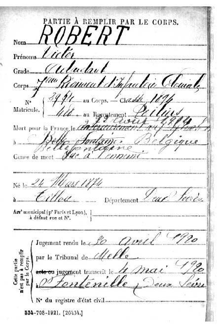 ROBERT Victor né le 24/03/1874 à TILLOU Adjudant 7° RIC DCD le 22/08/1914 à BELLEFONTAINE (BELGIQUE) Tué à l'ennemi |