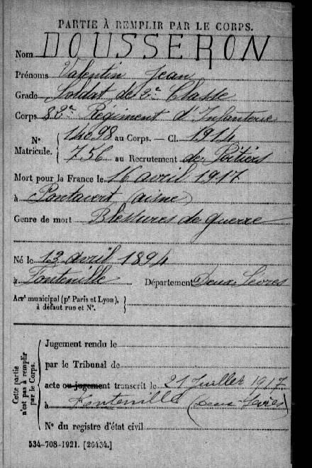 DOUSSERON Valentin Jean né le 13/04/1894 à FONTENILLE 2° Classe 82° RI DCD le 16/04/1917 à PONTAVERT (AISNE) Suie blessures de guerre |