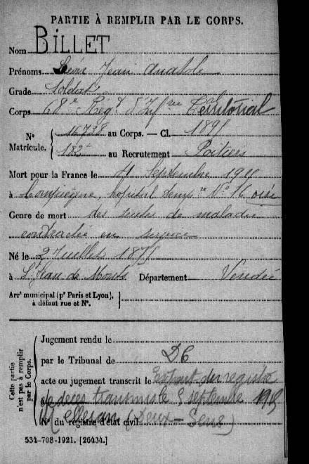 BILLET Léon Jean Anatole né le 02/07/1875 en VENDEE Soldat 68° RI DCD le 04/09/15 à COMPIEGNE suite maladie |