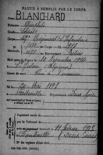 BLANCHARD Théophile né le 20/05/1893 à FONTENILLE Soldat 125° RI DCD le 10/11/14 à ST JULIEN (BELGIQUE) Tué à l'ennemi |