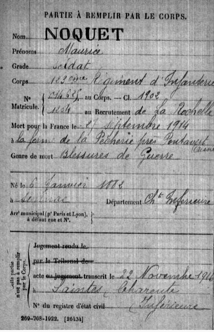 NOQUET Maurice 06-01-1882 17 - CHARENTE MARITIME SONNAC Soldat 123° RI DCD le 27/09/1914 dans l'Aisne suite blessures de guerre |