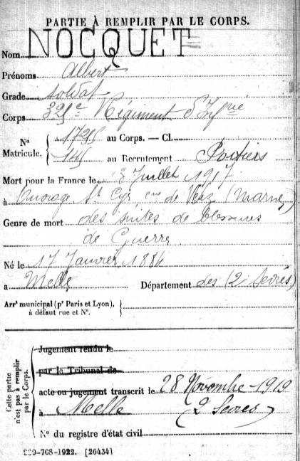 NOCQUET Albert 17-01-1884 79 - DEUX-SEVRES MELLE Soldat 325° RI DCD le 13/07/1917 dans la Marne suite de blessures de guerre |