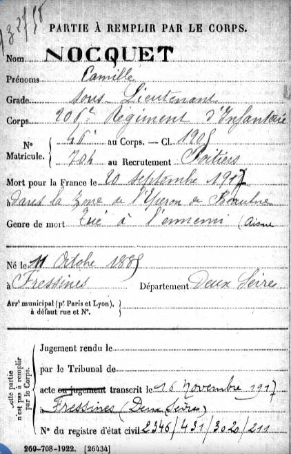 Camille NOCQUET Mort pour la France le 20-09-1917 (Vendresse-Beaulne - Tué dans la zone de l'Eperon de Beaulne., 02 - Aisne, France) Né(e) le/en 11-10-1885 à Fressines (79 - Deux-Sèvres, France) 31 ans, 11 mois et 9 jours Carrière Grade sous-lieutenant Unité 206e régiment d'infanterie (206e RI) Classe 1905 Bureau de recrutement Poitiers (86) Matricule au recrutement 704 Mention Mort pour la France Lieu de transcription du décèsFressines (79 - Deux-Sèvres, France)