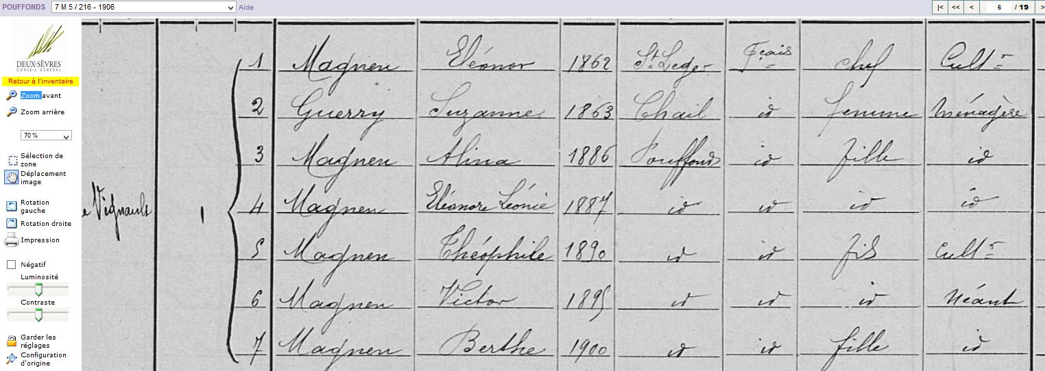 MAGNEN Alina DCD le 11/03/1979 à MAIRE L'EVESCAULT MAGNENLéonie DCD le 08/12/1970 à BRIOUX MAGNEN Théophile DCD le 21/02/1968 à POUFFONDS MAGNEN Berthe mariée le 16/06/1930 à BRIOUX avec Eugène PROUST