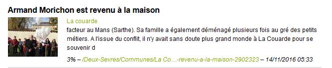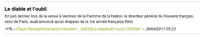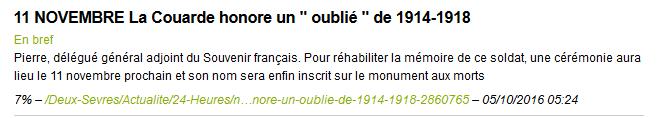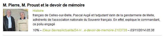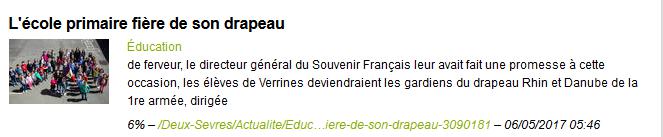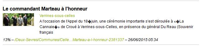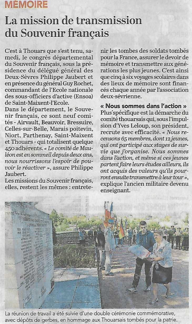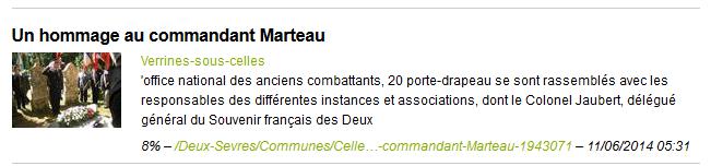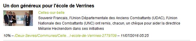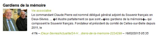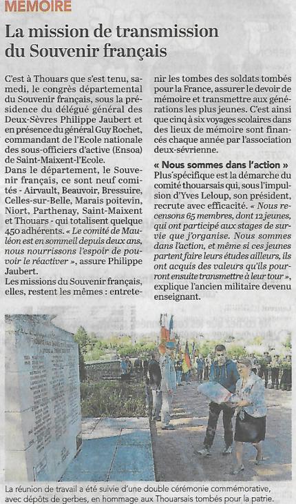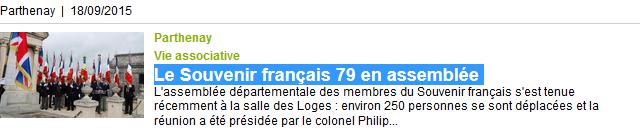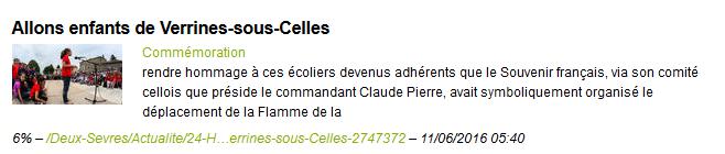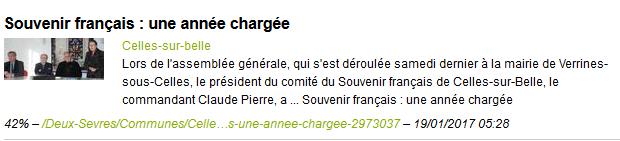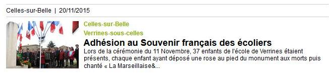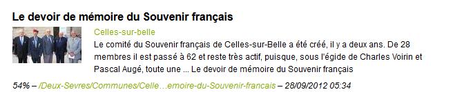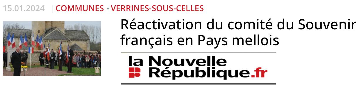 Le comité du Souvenir français a tenu sa grande réunion annuelle samedi dernier en la mairie de Verrines, présidée par le colonel Pothier, responsable départemental et son adjoint. Le commandant Claude Pierre a expliqué que les effectifs du comité vont croissant. Les travaux indispensables à la conservation des tombes ou des monuments de ceux qui ont donné leur vie pour leur pays seront entretenus ou refaits. Bien que le comité ait moins de deux ans, il sollicite auprès du siège national la subvention pour l'achat d'un drapeau, indispensable lors des cérémonies. Il espère obtenir satisfaction car, en septembre 2012, il organisera à Celles-sur-Belle, le congrès départemental du Souvenir français. « Nous avons découvert la tombe d'un soldat du contingent, mort en Algérie, alors qu'il accomplissait son devoir. Ce militaire est enterré dans le Cellois, au milieu d'une haie inaccessible, perdu au milieu des ronces, des bardanes et des chardons. Nous allons contacter la famille afin de voir si elle souhaite une autre sépulture, plus appropriée, pour ce défunt » a également déclaré Claude Pierre.