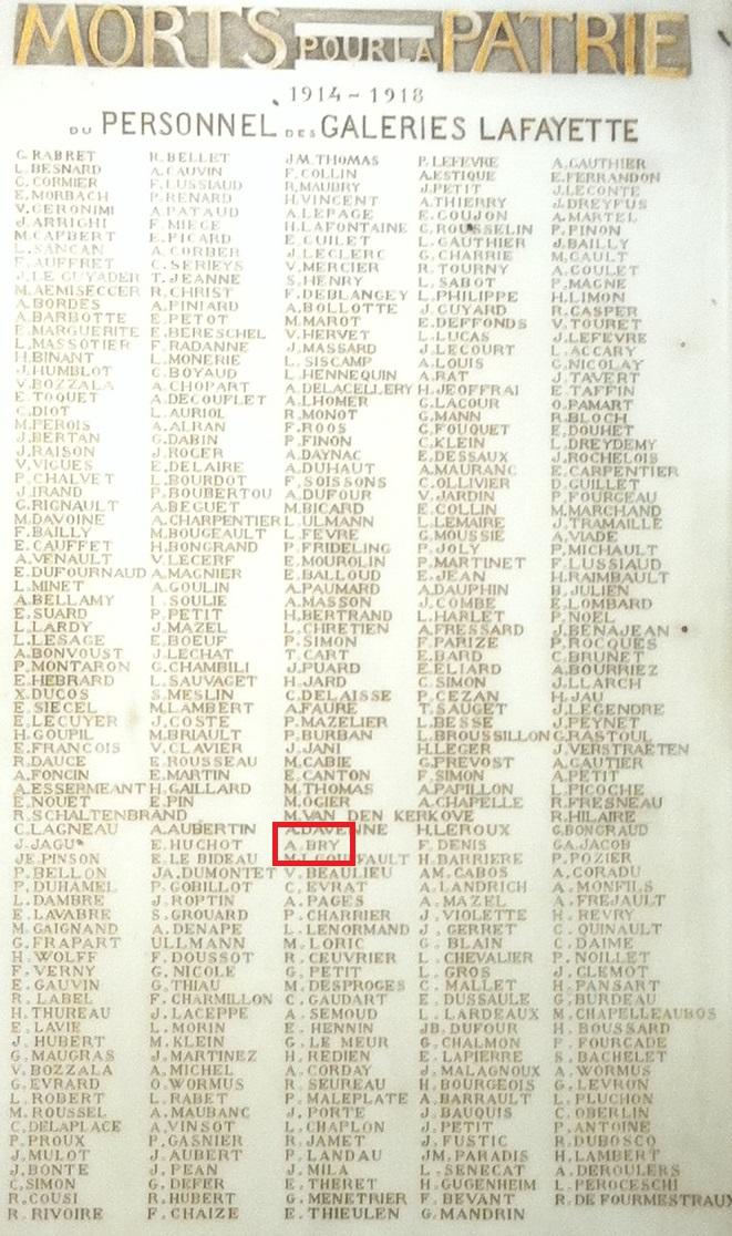 Son nom est inscrit sur une plaque commémorative des Galeries Lafayette à PARIS lorsqu'il a été mobilisé, il était employé de ce magasin. |