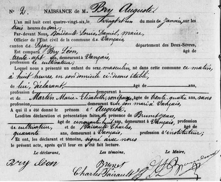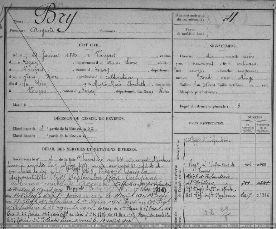 Auguste BRY Né le 21 janvier 1886 - Vançais, 79336, Deux Sèvres, Décédé Cultivateur