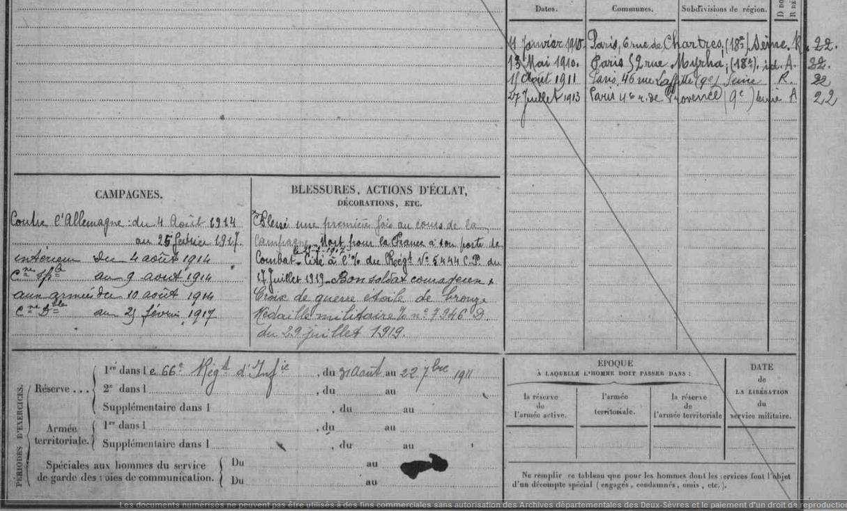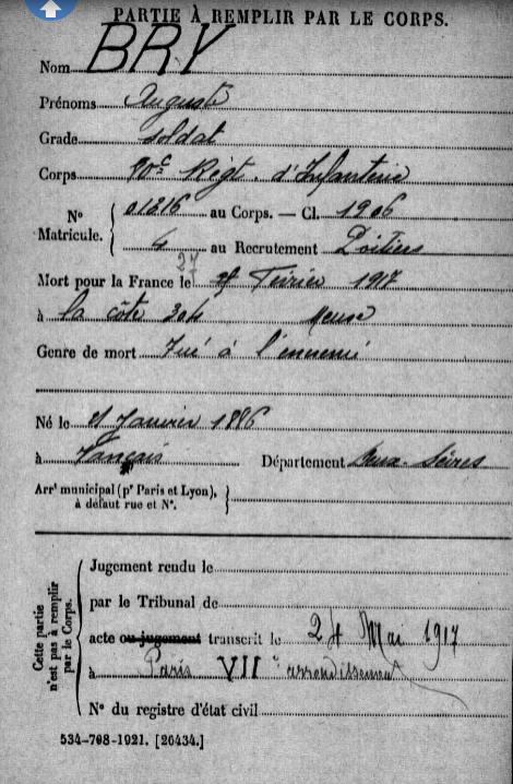 En résumé le soldat BRY Auguste est né à VANCAIS en 1886 son père BRY Léon (cultivateur) qui était originaire de Jassay de CHENAY avait épouse Mlle MARTIN Marie de VANCAIS le couple s'est établi chez les parents de Mlle MARTIN à VANCAIS (bourg) puis a repris la ferme Il y a eu au moins 4 enfants dont Auguste en 1886. Avant son service militaire entre 1907 et 1909 celui ci devait être placé ailleurs puis après son service, il a gagné la capitale pour être employé par les Galeries LAFAYETTE a été mobilisé le 10/08/1914. |